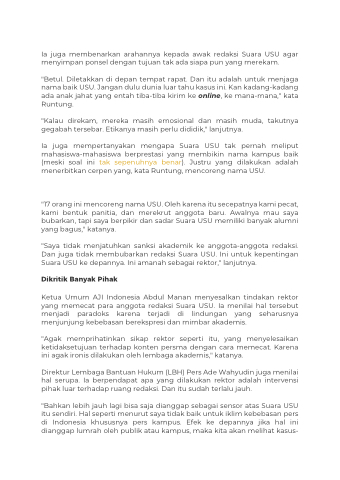 "Bahkan lebih jauh lagi bisa saja dianggap sebagai sensor atas Suara USU itu sendiri. Hal seperti menurut saya tidak baik untuk iklim kebebasan pers di Indonesia khususnya pers kampus. Efek ke depannya jika hal ini dianggap lumrah oleh publik atau kampus, maka kita akan melihat kasus-
