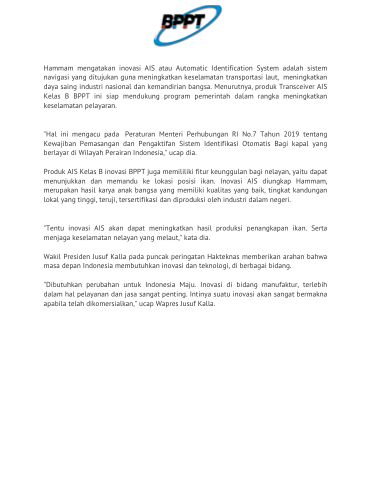 Hammam mengatakan inovasi AIS atau Automatic Identification System adalah sistem navigasi yang ditujukan guna meningkatkan keselamatan transportasi laut, meningkatkan daya saing industri nasional dan kemandirian bangsa. Menurutnya, produk Transceiver AIS Kelas B BPPT ini siap mendukung program pemerintah dalam rangka meningkatkan keselamatan pelayaran.