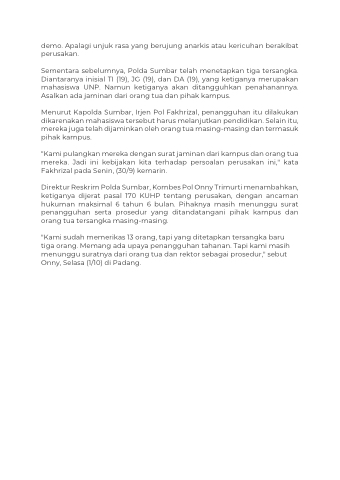 Direktur Reskrim Polda Sumbar, Kombes Pol Onny Trimurti menambahkan, ketiganya dijerat pasal 170 KUHP tentang perusakan, dengan ancaman hukuman maksimal 6 tahun 6 bulan. Pihaknya masih menunggu surat penangguhan serta prosedur yang ditandatangani pihak kampus dan orang tua tersangka masing-masing.
