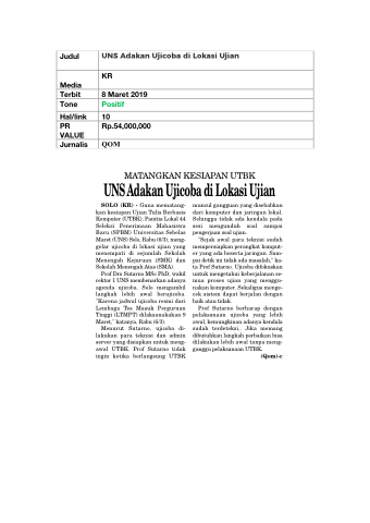 SOLO (KR) - Guna mematang- kan kesiapan Ujian Tulis Berbasis Komputer (UTBK), Panitia Lokal 44 Seleksi Penerimaan Mahasiswa Baru (SPBM) Universitas Sebelas Maret (UNS) Solo, Rabu (6/3), meng- gelar ujicoba di lokasi ujian yang menempati di sejumlah Sekolah Menengah Kejuruan (SMK) dan Sekolah Menengah Atas (SMA).