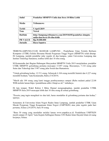 http://lampung.tribunnews.com/2019/04/05/pendaftar-sbmptn- unila-dan-itera-10-ribu-lebih