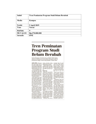 Judul Tren Peminatan Program Studi Belum Berubah Media Kompas Terbit 5 April 2019 Tone Netral Hal/link 9 PR VALUE Rp.270.000.000 Jurnalis DNE