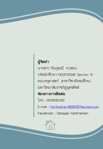 ผู้จัดท า นางสาว กัณฐมณี ทะสอน รหัสนักศึกษา 61031030106 Section 16 คณะครุศาสตร์ สาขาวิชาสังคมศึกษา มหาวิทยาลัยราชภัฏอุตรดิตถ์ ช่องทางการติดต่อ โทร : 0612690269 E-mail : Kanthamani19980917@gmail.com Facebook : Oengoei Kanthamani