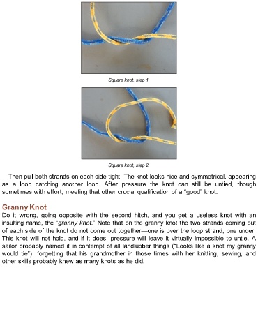 insulting name, the “granny knot.” Note that on the granny knot the two strands coming out