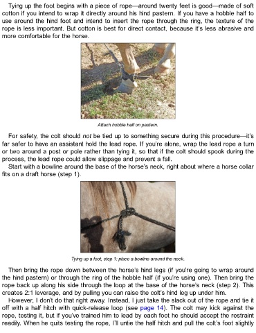 readily. When he quits testing the rope, I’ll untie the half hitch and pull the colt’s foot slightly