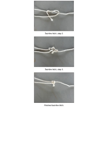 Taut-line hitch, step 2. Taut-line hitch, step 3. Finished taut-line hitch.
