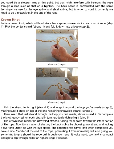 To tie a crown knot, which will lead into a back splice, unravel six inches or so of rope (step