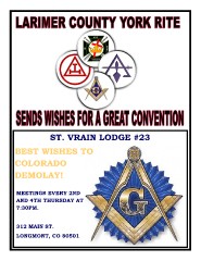 ST. VRAIN LODGE #23 BEST WISHES TO COLORADO DEMOLAY! MEETINGS EVERY 2ND AND 4TH THURSDAY AT 7:30PM. 312 MAIN ST. LONGMONT, CO 80501