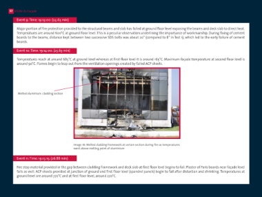 around 90°C. Flames begin to leap out from the ventilation openings created by failed ACP sheets. initiate a small secondary fire at the ground floor level outside the building. Flame temperature as measured through IR camera are around 910°C at