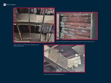 distortion of deck slab of ground level compartment at certain locations. Thus, Image 22: Failed POP sheets on exposure to fire