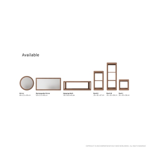 Available Mirror Rectangular Mirror Hanging Bath Rack II Rack III Rack I 65 x 2.5 x 65 cm 120 x 2.5 x 60 cm 120 x 50 x 40 cm 35 x 30 x 67 cm 35 x 30 x 96 cm 35 x 30 x 38 cm COPYRIGHT © 2019 KARPENTER BY IDESTUDIO WORLDWIDE. ALL RIGHTS RESERVED