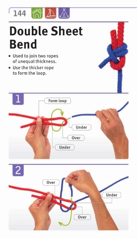 144 Double Sheet Bend Used to join two ropes of unequal thickness. Use the thicker rope to form the loop. Form loop Under Over Under Over Under Over