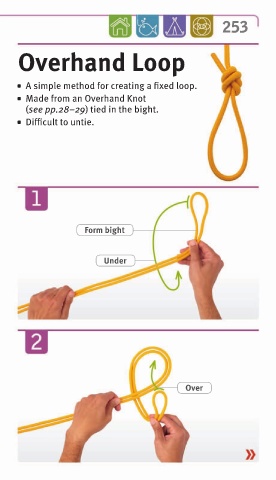 253 Overhand Loop A simple method for creating a fixed loop. Made from an Overhand Knot (see pp.28–29) tied in the bight. Difficult to untie. Form bight Under Over
