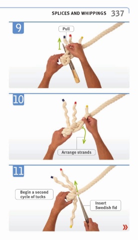 SPLICES AND WHIPPINGS 337 Pull Arrange strands Begin a second cycle of tucks Insert Swedish fid