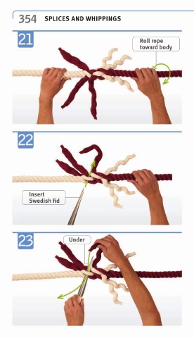 354 SPLICES AND WHIPPINGS Roll rope toward body Insert Swedish fid Under