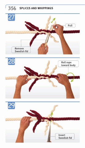 356 SPLICES AND WHIPPINGS Pull Remove Swedish fid Roll rope toward body Insert Swedish fid