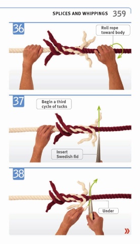 SPLICES AND WHIPPINGS 359 Roll rope toward body Begin a third cycle of tucks Insert Swedish fid Under