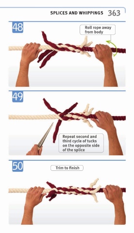 SPLICES AND WHIPPINGS 363 Roll rope away from body Repeat second and third cycle of tucks on the opposite side of the splice Trim to finish