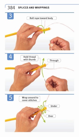 384 SPLICES AND WHIPPINGS Roll rope toward body Hold thread with thumb Through Wrap around to cover stitches Under Over