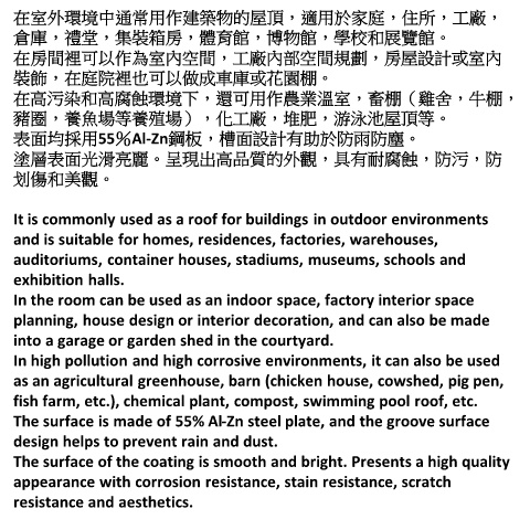 在室外環境中通常用作建築物的屋頂,適用於家庭,住所,工廠,