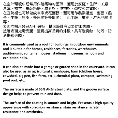 在室外環境中通常用作建築物的屋頂,適用於家庭,住所,工廠,