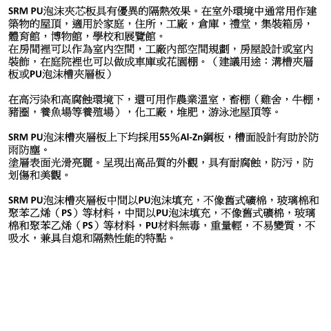 SRM PU泡沫槽夾層板上下均採用55%Al-Zn鋼板,槽面設計有助於防