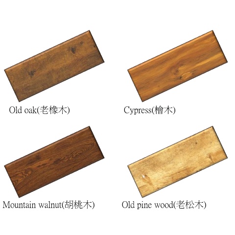 Old oak(老橡木) Cypress(檜木) Mountain walnut(胡桃木) Old pine wood(老松木)