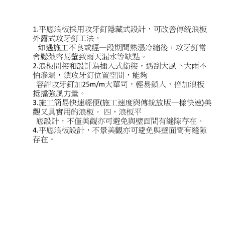 1.平底浪板採用攻牙釘隱藏式設計,可改善傳統浪板 外露式攻牙釘工法, 如遇施工不良或經一段期間熱漲冷縮後,攻牙釘常 會鬆弛容易肇致雨天漏水等缺點。 2.浪板間接和設計為插入式銜接,遇刮大風下大雨不 怕滲漏,鎖攻牙釘位置空間,能夠 容許攻牙釘加25m/m大華司,輕易鎖入,倍加浪板 抵擋強風力量。 3.施工簡易快速輕便(施工速度與傳統放版一樣快速)美 觀又具實用的浪板。 四,浪板平 底設計,不僅美觀亦可避免與壁面間有縫隙存在。 4.平底浪板設計,不景美觀亦可避免與壁面間有縫隙 存在。