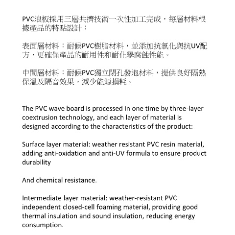 PVC浪板採用三層共擠技術一次性加工完成,每層材料根