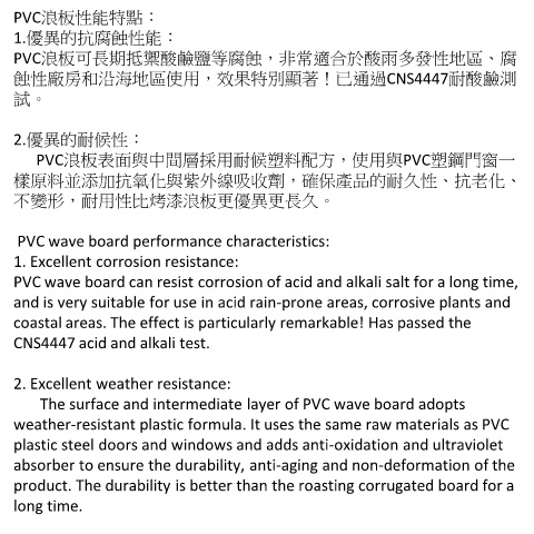 PVC浪板可長期抵禦酸鹼鹽等腐蝕,非常適合於酸雨多發性地區、腐