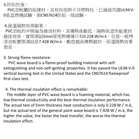 PVC浪板屬防焰建材,具有自熄與不自燃特性,已通過美國UL94 V-