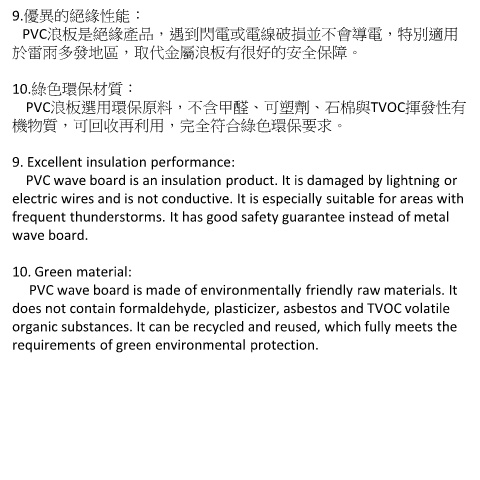 PVC浪板是絕緣產品,遇到閃電或電線破損並不會導電,特別適用