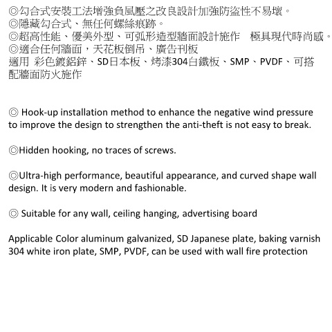 適用 彩色鍍鋁鋅、SD日本板、烤漆304白鐵板、SMP、PVDF、可搭