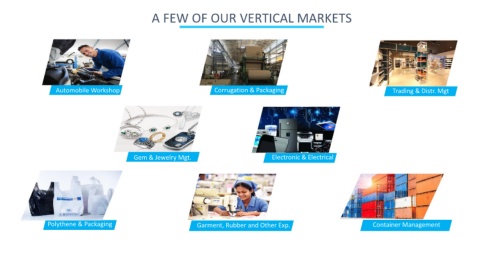 A FEW OF OUR VERTICAL MARKETS Automobile Workshop Corrugation & Packaging Trading & Distr. Mgt Gem & Jewelry Mgt. Electronic & Electrical Polythene & Packaging Garment, Rubber and Other Exp. Container Management