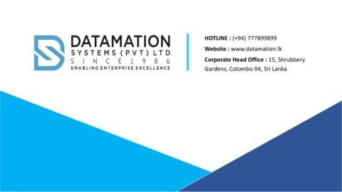 HOTLINE : (+94) 777899899 Website : www.datamation.lk Corporate Head Office : 15, Shrubbery Gardens, Colombo 04, Sri Lanka