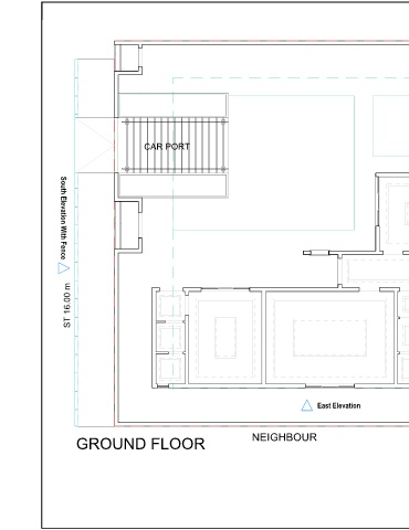 1 2 CAR PORT 1 N South Elevation With Fence ST 16.00 m UP 1 25 DOWN 2 3 4 22 24 23 21 5 6 20 25R x 0.15 24G x 0.28 19 7 8 18 9 17 10 East Elevation NEIGHBOUR GROUND FLOOR A 3 A 0 0 1 0