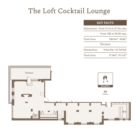 The Loft Cocktail Lounge KEY FACTS Dimensions From 3.7m to 27.5m max From 12ft to 90.2ft max Total Area 138.4m2 / 454ft2 Terrace Dimensions 9.6x2.9m / 31.5x9.6ft Total Area 27.8m2 / 91.3 ft2 Terrace Reception 80 Guests Bar