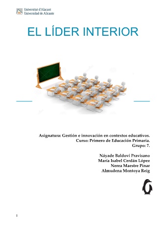 EL LÍDER INTERIOR Asignatura: Gestión e innovación en contextos educativos. Curso: Primero de Educación Primaria. Grupo: 7. Náyade Baldoví Pravisano María Isabel Cerdán López Nerea Maestre Pinar Almudena Montoya Reig 1