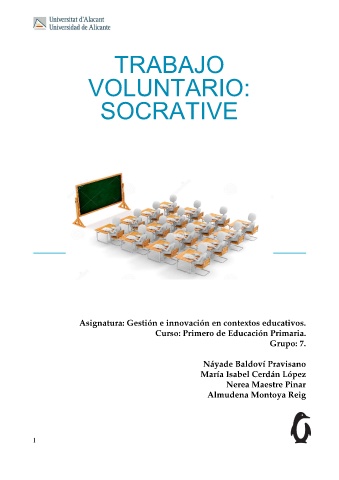 TRABAJO VOLUNTARIO: SOCRATIVE Asignatura: Gestión e innovación en contextos educativos. Curso: Primero de Educación Primaria. Grupo: 7. Náyade Baldoví Pravisano María Isabel Cerdán López Nerea Maestre Pinar Almudena Montoya Reig 1