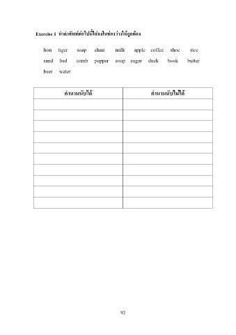 Exercise 1 นําคําศัพทตอไปนี้ใสลงในชองวางใหถูกตอง lion tiger soap chair milk apple coffee shoe rice sand bed comb pepper soup sugar duck book butter beer water คํานามนับได คํานามนับไมได 92