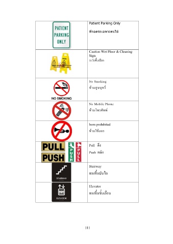 Patient Parking Only ที่จอดรถเฉพาะคนไข Caution Wet Floor & Cleaning Sign ระวังพื้นเปยก No Smoking หามสูบบุหรี่ No Mobile Phone หามโทรศัพท horn prohibited หามใชแตร Pull ดึง Push ผลัก Stairway ทางขึ้นบันได Elevator ทางขึ้นชั้นเลื่อน 111