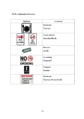 เรื่องที่ 4 สัญลักษณตามรานอาหาร สัญลักษณ ความหมาย Restaurant รานอาหาร No pets allowed หามนําสัตวเลี้ยงเขา Reserved จองแลว No smoking หามสูบบุหรี่ Telephone โทรศัพท Restaurant รานอาหาร เชา กลางวัน เย็น 114