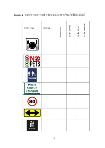 Exercise 2 จงบอกความหมายของปายสัญลักษณและสถานที่พบเห็นปายสัญลักษณ Symbol/sign Meaning In the street At the hospital At the school At the restaurant 116