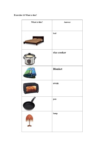 Exercise 10 What is this? What is this? Answer bed rice cooker Blanket oven pan lamp