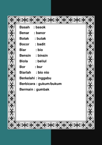 Basah : basok Benar : banor Botak : butak Bocor : badit Biar : bio Bensin : binsin Biola : beliul Bor : bur Biarlah : bio nio Berkelahi : inggabu Berbicara : gukum/bukum Bermain : gumbak
