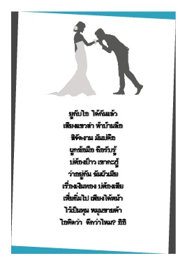 ยูกับไอ ได้กันแล้ว เสียงแซวส่ำ ห้ำบ้ำนลือ สิจัดงำน มันบ่คือ ผูกข้อมือ ถือรับรู้ บ่ต้องป๊ำว เขำกะฮู้ ว่ำอยู่กัน ฉันผัวเมีย เรื่องเงินทอง บ่ต้องเสีย เหี่ยถิ่มไป เพียงได้หน้ำ ไว้เป็นทุน หมุนขำยค้ำ ไอคิดว่ำ ดีกว่ำไหม? อิอิ