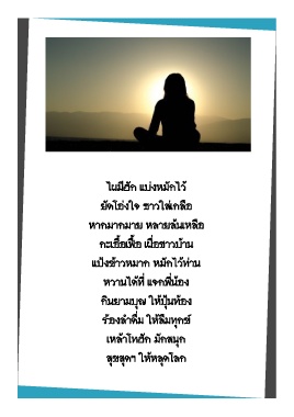 ไผมีฮัก แบ่งหมักไว้ ยัดโอ่งใจ ซำวใส่เกลือ หำกมำกมำย หลำยล้นเหลือ กะเอื้อเฟื้อ เผื่อชำวบ้ำน แป้งข้ำวหมำก หมักไว้ท่ำน หวำนได้ที่ แจกพี่น้อง กินยำมบุญ ให้ปุ้นท้อง ร้องล ำดื่ม ให้ลืมทุกข์ เหล้ำโทฮัก มักสนุก สุขสุดๆ ให้หลุดโลก