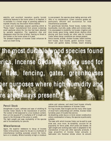 or the the home where it is used The pleasant fragrance of Incense Cedar enhances its value as closet lining is ever-present the species gives lasting services with little or no