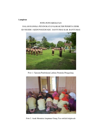 Lampiran FOTO-FOTO KEGIATAN DALAM RANGKA PENINGKATAN KARAKTER PESERTA DIDIK SD NEGERI 1 KEDUNGGEDE KEC. BANYUMAS KAB. BANYUMAS Foto 1. Upacara Pembukaan Latihan Pramuka Penggalang Foto 2. Anak Meminta Ampunan Orang Tua setelah Istighosah