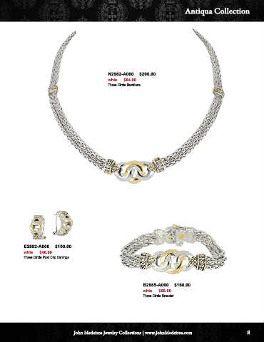 Antiqua Collection N2982-A000 $200.00 whls $84.00 Three Circle Necklace E2992-A000 $100.00 whls $40.00 Three Circle Post Clip Earrings B2985-A000 $160.00 whls $68.00 Three Circle Bracelet John Medeiros Jewelry Collections | www.JohnMedeiros.com 8